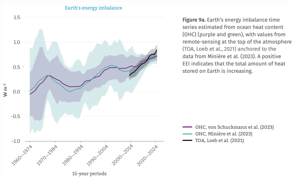Energiobalansen mäter hur mycket energi som lagras i klimatsystemet – skillnaden mellan den energi som kommer in från solen och den som strålar ut i rymden. Det är det fundamentala måttet på hur mycket värme planeten ackumulerar, oavsett hur den för tillfället fördelas mellan hav, luft och is.