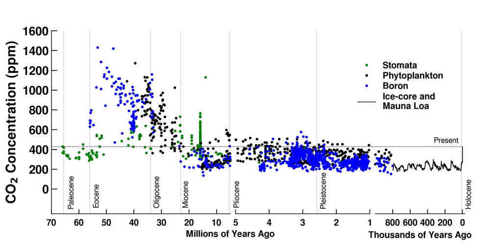 Grafik: Halten koldioxid i atmosfären 70 miljoner år tillbaka i tiden fram till idag. Notera de olika skalorna på x-axeln. De senaste 800.000 åren har vi haft istider om som kommer och går, då har halten koldioxid varierat mellan 180 och 300 ppm (delar av miljon). Just nu är halten koldioxid 430 pmm. Förra gången den var så hög var för 2 eller 3 miljoner år sedan. Det var när planeten inte hade de stora glaciärerna på Grönland och Antarktis. Källa: https://keelingcurve.ucsd.edu/