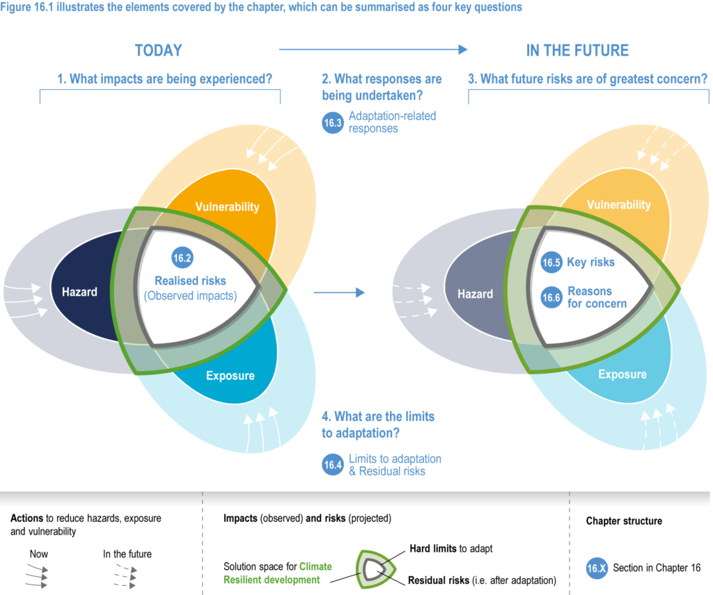 Grafik från IPCC AR6. Bildtext i original: The arrows illustrate actions to reduce hazard, exposure and vulnerability, which shape risks over time. Accordingly, the green areas at the centre of the propeller diagrams indicate the ability for such solutions to reduce risk, up to certain adaptation limits, leaving the white residual risk (or observed impacts) in the centre. The shading of the right-hand-side propeller diagram compared with the non-shaded one on the left reflects some degree of uncertainty about future risks. The figure builds on the conceptual framework of risk–adaptation relationships used in SROCC (Garschagen et al., 2019).